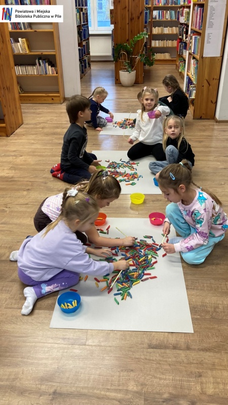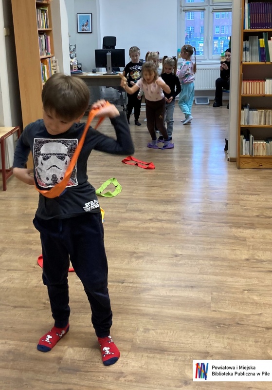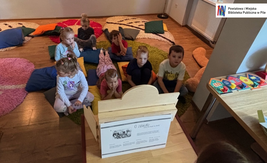 Podczas warsztatów dzieci przeniosły się w świat bajkowych historii. Wysłuchały opowieści ukrytej w teatrzyku Kamishibai „Noc w Bibliotece”, opowiadającej o Krasnoludku, który zgubił swoją bajkę.