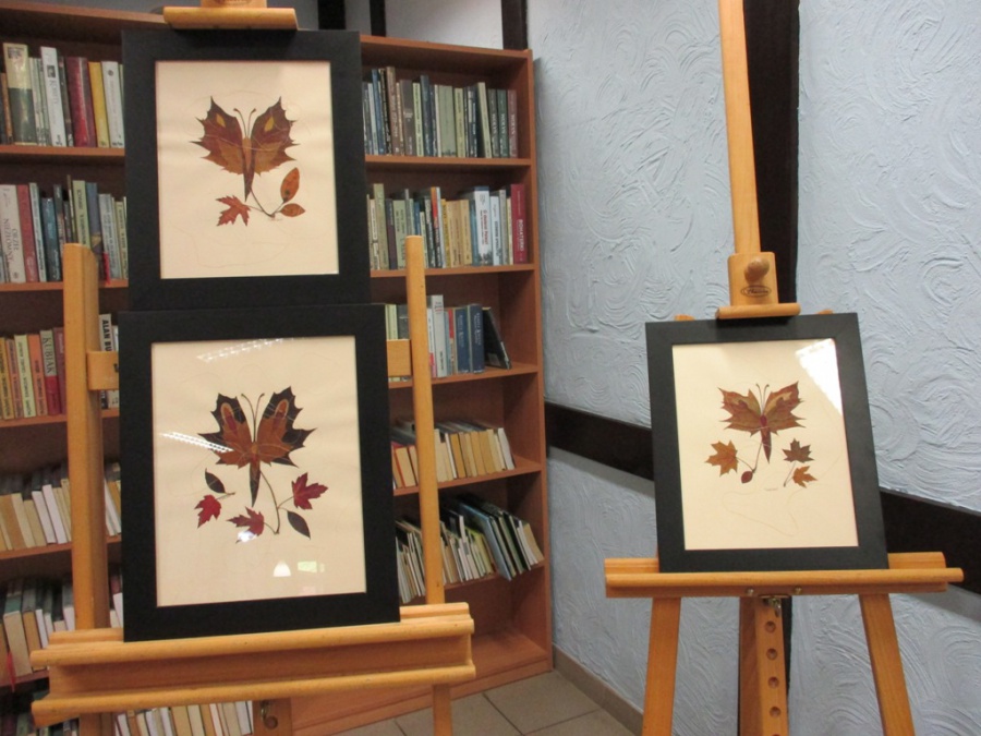 Prezentacja obrazów w formie kolażu z liści Teresy Loos.