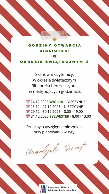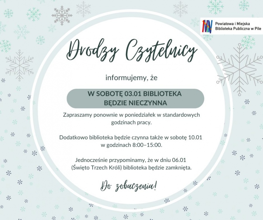 Uprzejmie informujemy, że w sobotę 03.01 biblioteka będzie nieczynna.