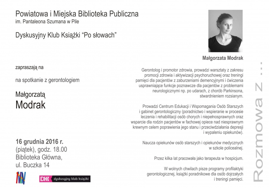 Zapraszamy na spotkanie z Małgorzatą Modrak, gerontologiem, autorką ćwiczeń pamięci dla osób z zaburzeniami demencyjnymi.